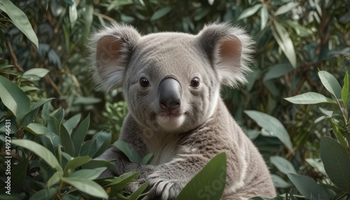 Fototapeta premium Adorable koala joey nestled amongst eucalyptus leaves in a repeating pattern , cuddly, australia