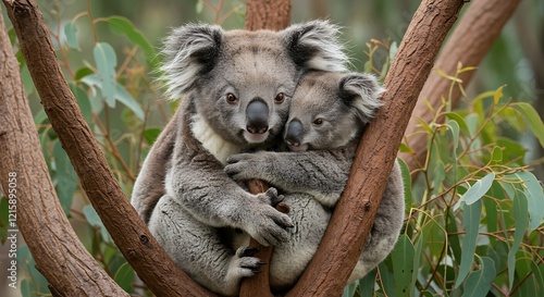 Fototapeta premium Adorable Koala Mother and Baby Hugging in Tree