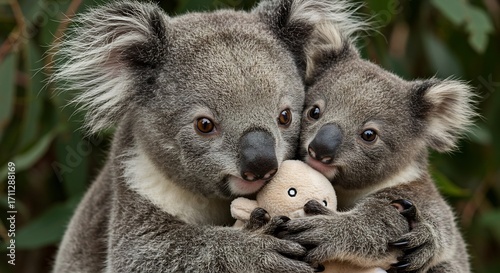 © lananh, Obraz premium Adorable koala mother gently cradles her joey soft sunlight bathes them in warmth. AI Generated