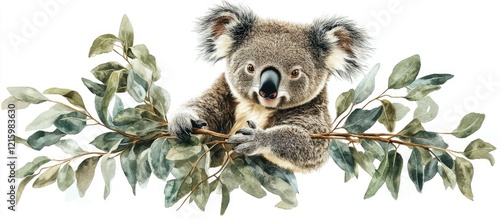 Fototapeta premium Adorable Koala on Eucalyptus Branch Watercolor Painting