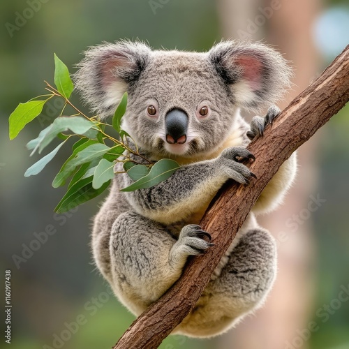 Naklejka premium Adorable koala perched on a tree branch, showcasing its fuzzy fur, bright eyes, and vibrant green eucalyptus leaves in a natural habitat setting.