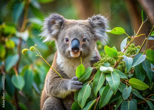 Obraz premium Adorable koala perched peacefully in a eucalyptus tree, munching on fresh...