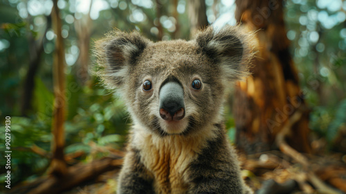 © khonkangrua, Fototapeta premium Adorable koala with wide eyes staring curiously into the camera, surrounded by a lush, green forest environment.