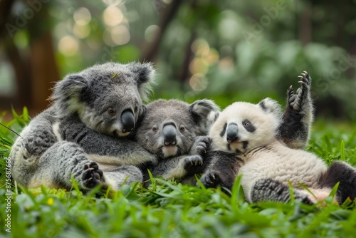 Obraz premium Adorable Koalas and Panda Cub Playing Together