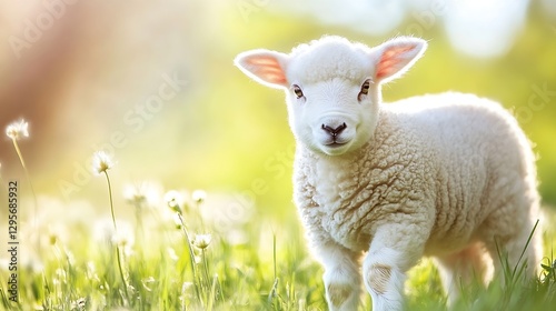 © Generative AI, Obraz premium Adorable Lamb Grazing in a Sunny Meadow Surrounded by Blossoms : Generative AI