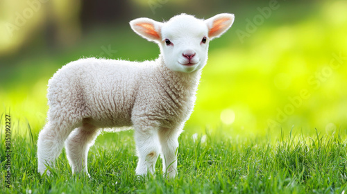 © Ruszalina, Obraz premium Adorable Lamb Standing in a Green Pasture