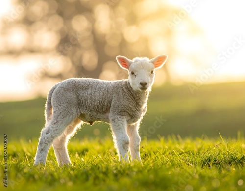 © jodi, Obraz premium Adorable lamb standing in sunlight, bathed in golden hour glow