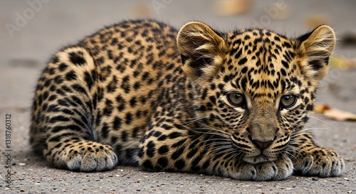 © Duc, Naklejka premium Adorable leopard cub rests peacefully soft light illuminates its spots. AI Generated