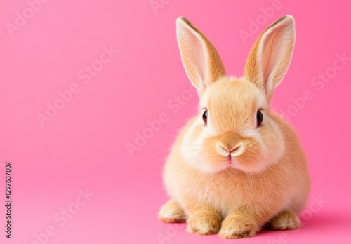© STK, Obraz premium Adorable light brown bunny rabbit sitting against a solid pink background. The bunny is facing the camera and appears soft and fluffy