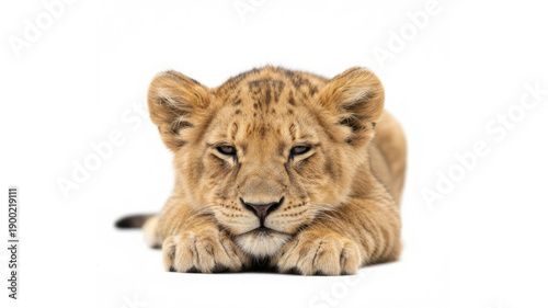 © Big, Obraz premium Adorable Lion Cub Resting With Front Paws Forward, Soft Golden Fur, Curious Eyes