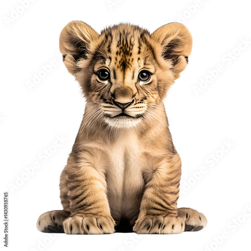 © Jack, Fototapeta premium Adorable lion cub sitting and looking forward, isolated on transparent background