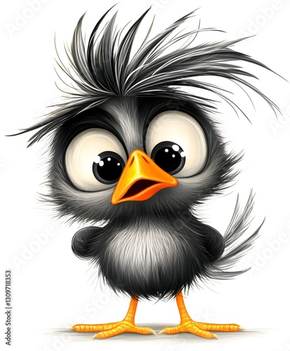 © Anuson, Fototapeta premium Adorable little black bird with big eyes and fluffy feathers isolated on a white background showcasing its cuteness