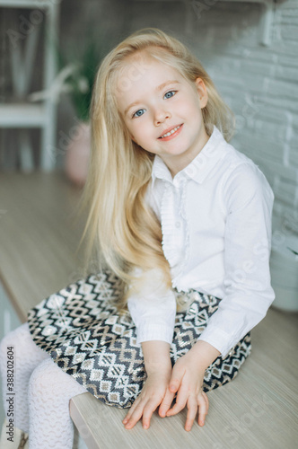 © Andreshkova Nastya, Fototapeta premium Adorable little cute blondie girl smiling at home