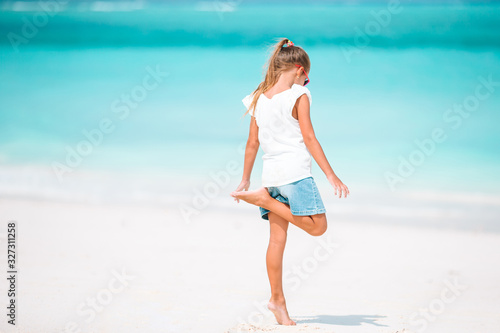 Fototapeta premium Adorable little girl have fun at tropical beach during vacation
