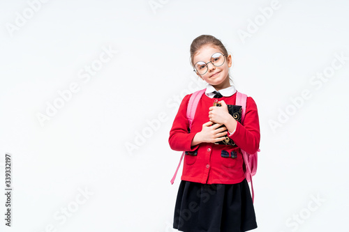 © zamuruev, Fototapeta premium Adorable little girl in red school jacket, black dress, backpack and rounded glasses hugs a book tightly and smiles while enjoying and posing on white studio background. Isolate.