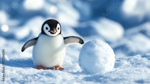 Fototapeta premium Adorable little penguin happily pushing a snowball across an icy,frozen...