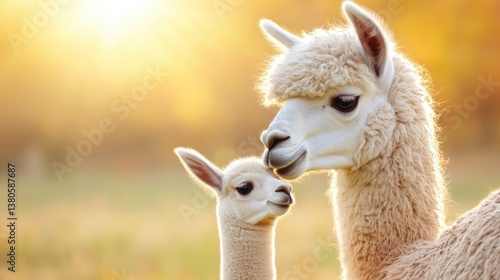 Obraz premium Adorable llama and baby in sunlit pasture during golden hour. Mother's Day,...