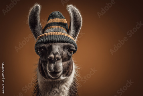 Obraz premium Adorable llama portrait wearing a trendy beanie hat against a warm brown backdrop, ideal for humorous designs or animal-themed campaigns