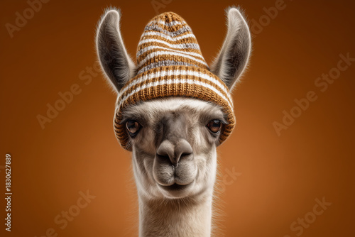 Naklejka premium Adorable llama wearing a cozy striped beanie hat with endearing eyes, perfect...