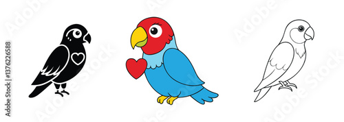 Obraz premium Adorable Lovebird Illustrations Black, Color, Outline Parrot Designs