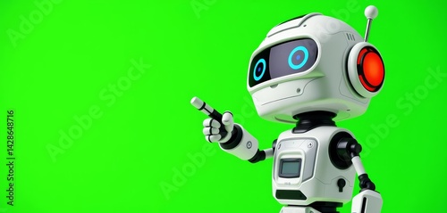 Fototapeta premium Adorable mini robot pointing, vibrant green background, whimsical, image