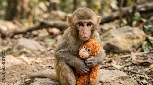 © Irtiko, Naklejka premium Adorable monkey hugging teddy bear in forest