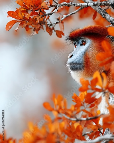 © tonpreecha, Fototapeta premium Adorable Monkey Peeking Through Vibrant Autumn Foliage Looking Outwards