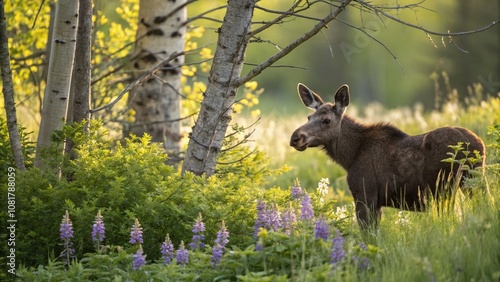 © Danicha, Fototapeta premium Adorable Moose Calf in Late Spring Grazing Among Lush Greenery with Soft Sunlight, Perfect for Nature Lovers and Wildlife Enthusiasts, Featuring Copy Space for Text Overlay