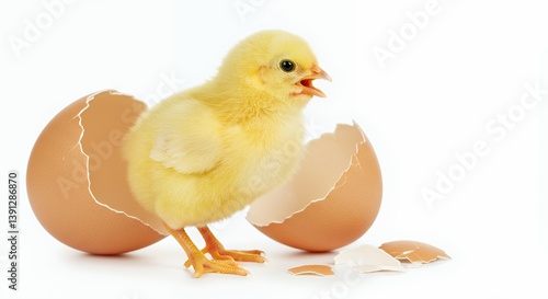 Fototapeta premium Adorable newborn chick emerging from eggshell on a white background