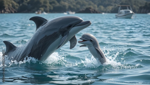 © Nadir, Fototapeta premium Adorable Newborn Dolphin Leaps Beside Mother in Sparkling Ocean Waters