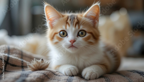 © inung02, Fototapeta premium Adorable orange and white kitten resting on a plaid blanket, looking directly at the camera with big, bright eyes