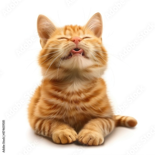 © Autaporn, Obraz premium Adorable orange kitten with eyes closed, tongue out, and content expression, isolated on white background.