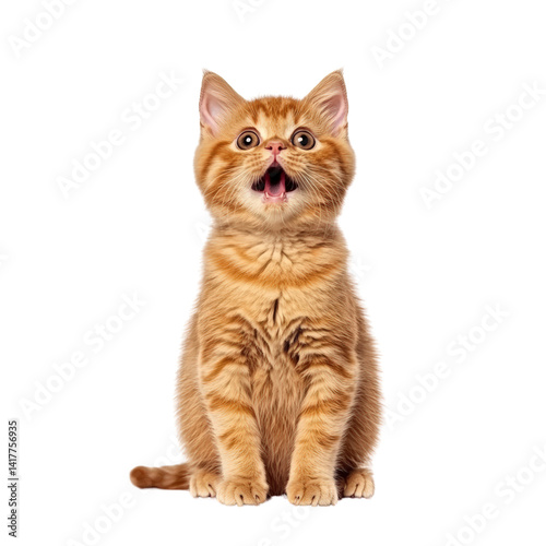 © Watcharaporn, Obraz premium Adorable Orange Tabby Kitten Sitting Up Front View Looking Curious with Bright Eyes and Playful Expression on White Background
