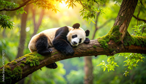 © kyme, Obraz premium Adorable Panda Asleep in a Tree