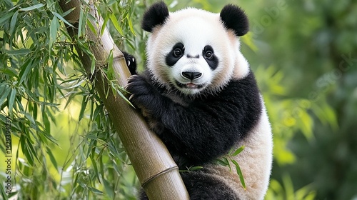 © Lasio, Obraz premium Adorable panda bear clinging to tree trunk in lush green forest