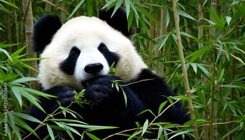 Fototapeta premium Adorable Panda Bear Munching on Bamboo in Lush Forest