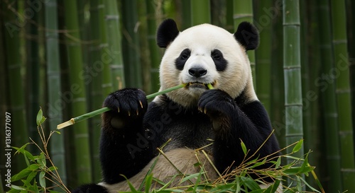 © Duc, Obraz premium Adorable panda calmly munches bamboo stalks bathed in soft sunlight. AI Generated