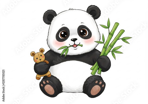 Fototapeta premium Adorable Panda Cub Eats Bamboo Softly. AI Generated