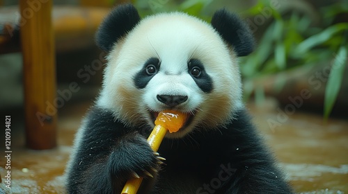 Fototapeta premium Adorable panda cub enjoying a sweet orange popsicle.