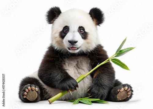 Naklejka premium Adorable Panda Cub Holding Bamboo, Isolated on White Background