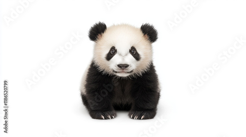 Naklejka premium Adorable panda cub, sitting, facing camera, white background.