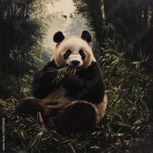 © Kopgz-41, Obraz premium Adorable Panda Devouring Bamboo in Soft Light 1