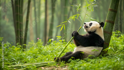 © Kanika Graphic, Fototapeta premium Adorable panda sitting on ground munching on bamboo in tranquil forest