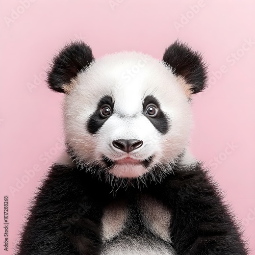 Fototapeta premium Adorable panda with expressive eyes against a pink background