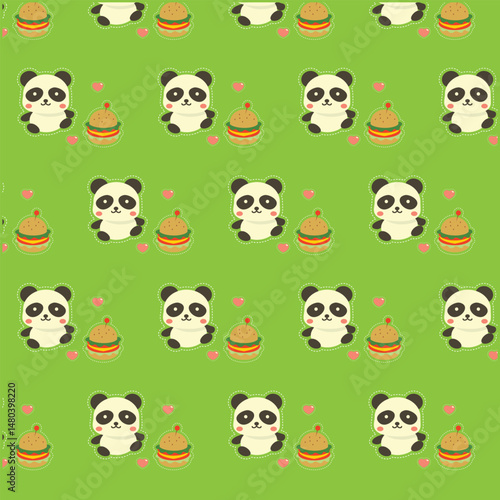 © Mushkan, Naklejka premium Adorable Pandas with Burgers on Green Background