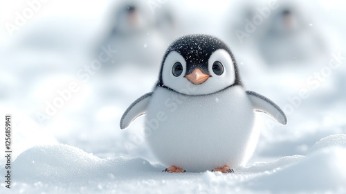 © mas, Fototapeta premium Adorable penguin chick standing in snowy landscape with other penguins blurred in background