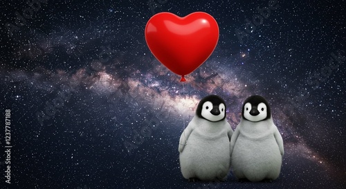 © ahmad, Obraz premium Adorable Penguin Couple with Heart Balloon in Space Romantic Galaxy Background