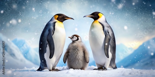 © Four888, Fototapeta premium Adorable Penguin Family in Antarctic Snowscape: Winter Wildlife Scene