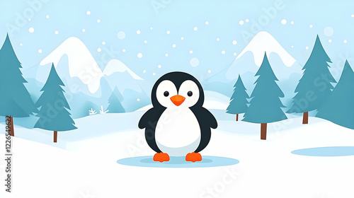 © Lailatul, Naklejka premium Adorable penguin in snowy mountains; winter wonderland background; children's book illustration