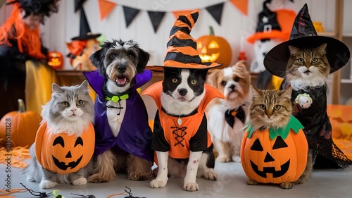 © Farkhanda, Fototapeta premium Adorable pets dressed in Halloween costumes for a fun, festive competition. Perfect for pet, holiday.